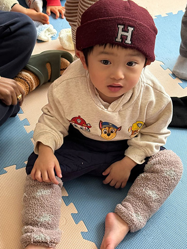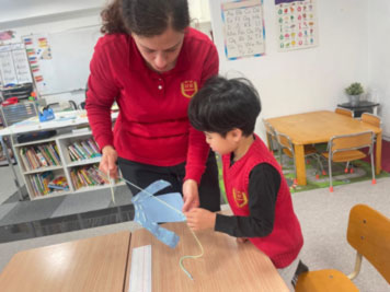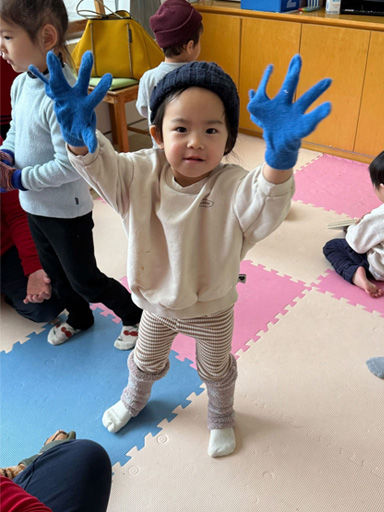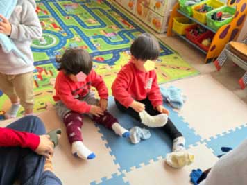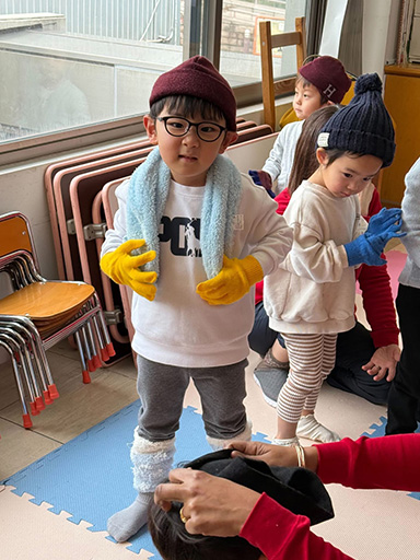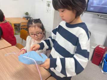 It’s been cold every day lately. In the little kids class that day, they were learning about “winter clothes.” “What kind of clothes do we wear when going outside on cold days?” They’re learning about changing clothes according to the season and weather, and gaining essential life skills through personal experience—all in English. Is it hard to put them on by yourself? Can you do it? The teachers could see their growth in the children’s earnest efforts as they tried their best. In the big kids class, they were making sweaters with yarn. They threaded the yarn however they liked, creating their very own clothes.