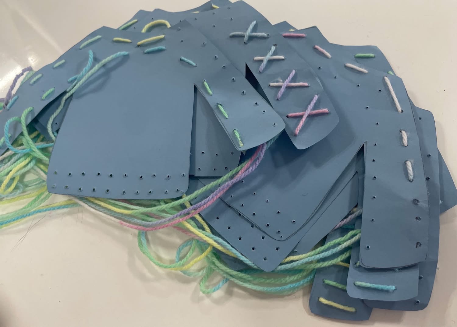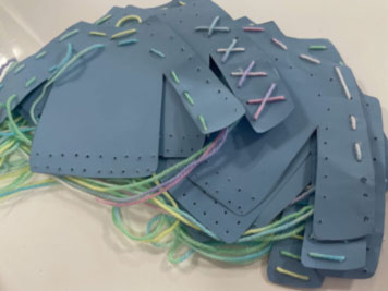 自分で着用するのは難しい?できるかな?と一生懸命トライする姿に先生たちも成長を感じていました。大きい子のクラスでは毛糸でセーターを作っていました。好きなように毛糸を通し、自分だけの洋服を作りました。